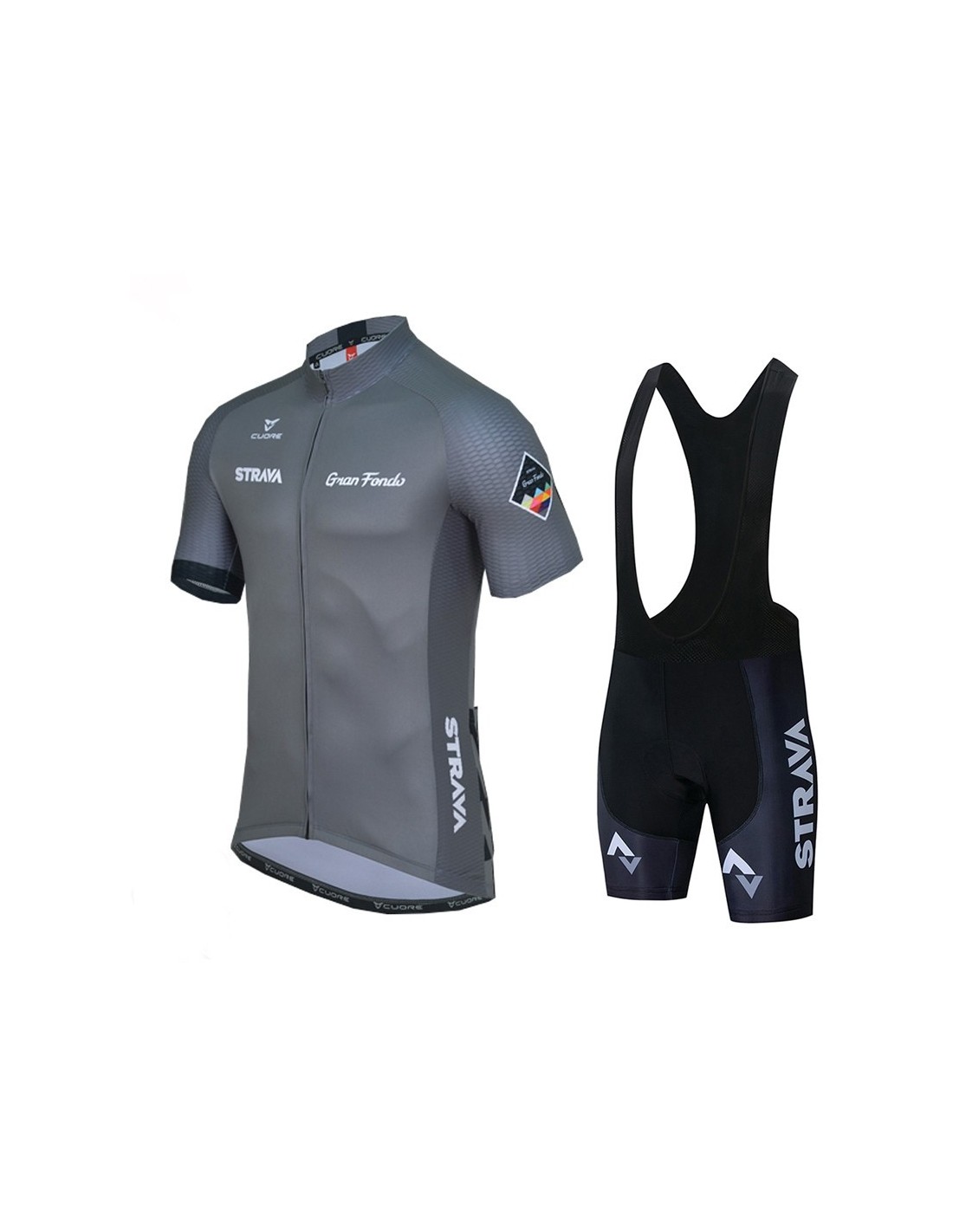 La **equipación corta con tirante STRAVA** está confeccionada con materiales de primera calidad que garantizan un rendimiento óptimo:- **Culote**: Compuesto por un 80% de poliéster y un 20% de lycra, este culote cuenta con un sistema **Coolmax** que asegura que la badana se mantenga en su lugar, evitando movimientos indeseados durante el pedaleo.- **Maillot**: Fabricado al 100% en poliéster, el maillot ofrece una transpirabilidad excepcional, manteniendo al ciclista fresco incluso en condiciones extremas de calor.Comodidad y Funcionalidad del Culote