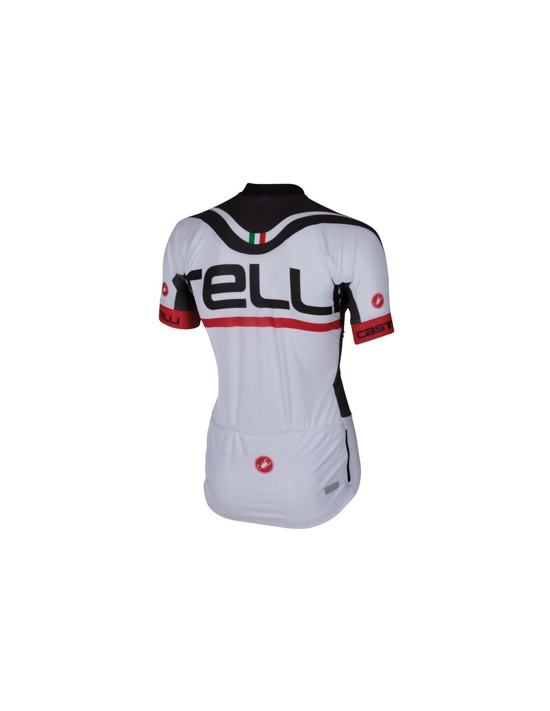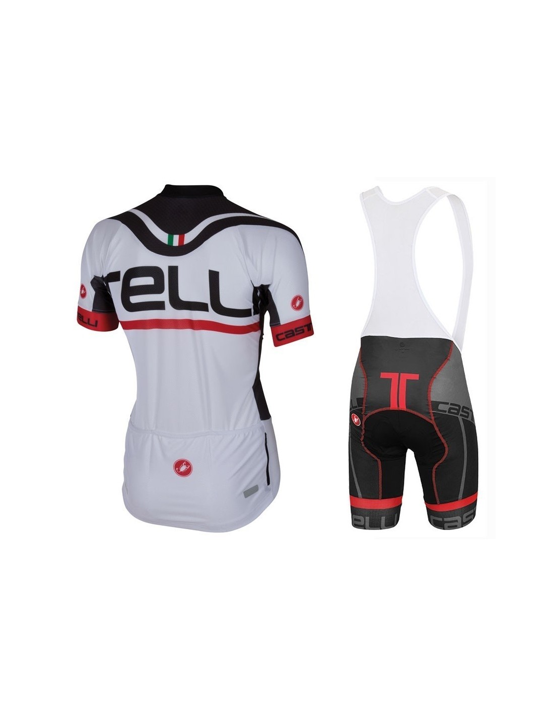 El maillot de la equipación Castelli está hecho de 100% poliéster y cuenta con características que mejoran la experiencia del ciclista:- Bolsillos traseros: Incluye tres bolsillos para guardar botellas de agua y otros artículos esenciales.
