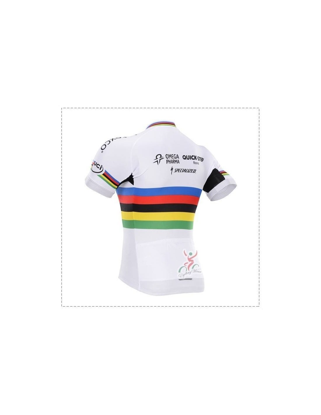 El maillot de ciclismo Quick Step UCI está hecho 100% de poliéster y presenta un diseño exclusivo que resalta por su funcionalidad. Las características clave son:- Bolsillos traseros: Tres compartimentos ideales para llevar botellas de agua u otros útiles.